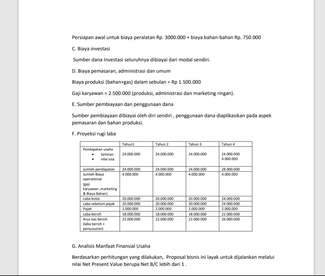 Proposal usaha Kewirausahaan meliputi Deskripsi perusahaan, Aspek pemasaran, Aspek Produksi, Aspek Keuangan dan kesimpulan